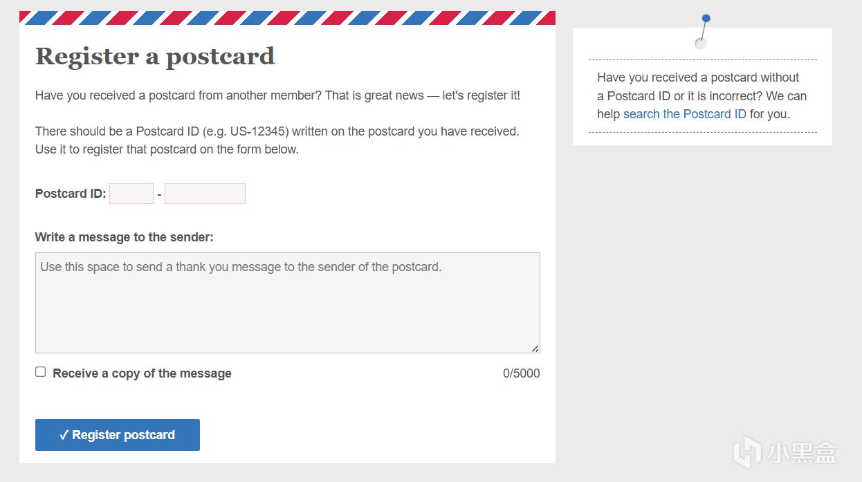 拿到您收到的明信片,将上面写的Postcard ID填写在页面上的对应位置中,您还可以在下方的Write a message to the sender(向发件人写消息)中向这张卡片的发送者写一段您想说的话,随后点击Register Postcard(登记明信片)按钮,即可成功登记您收到的明信片