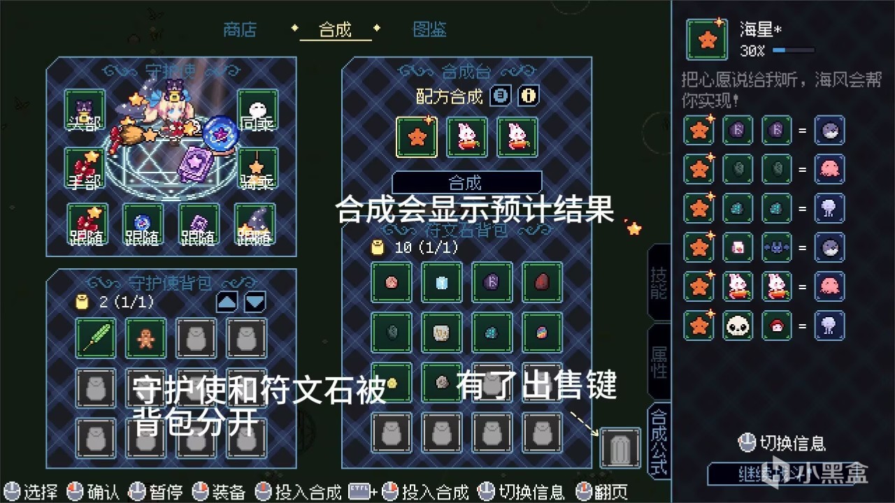 商店合成图鉴大分家!: 之前守护使合成和商店和合成石都挤在一页,找起来眼花缭乱?现在彻底分页管理了!“守护使合成”有自己专属的一页,“合成石”也有独立背包,清晰明了,一目了然!