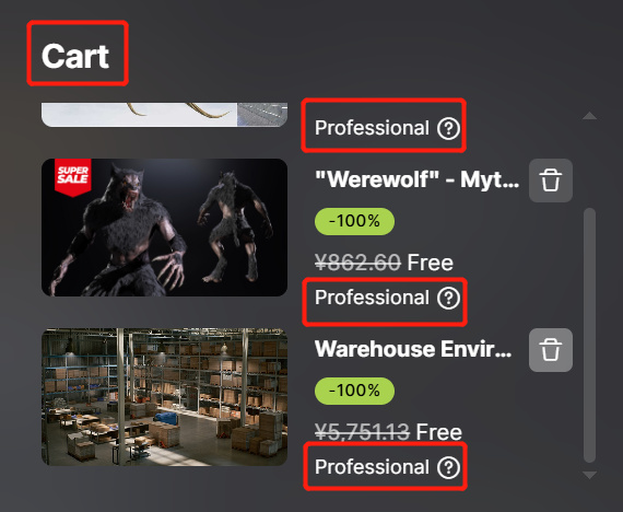 在將資源添加購物車前,記得要將默認的個人(Personal)許可改爲專業(Professional)許可。