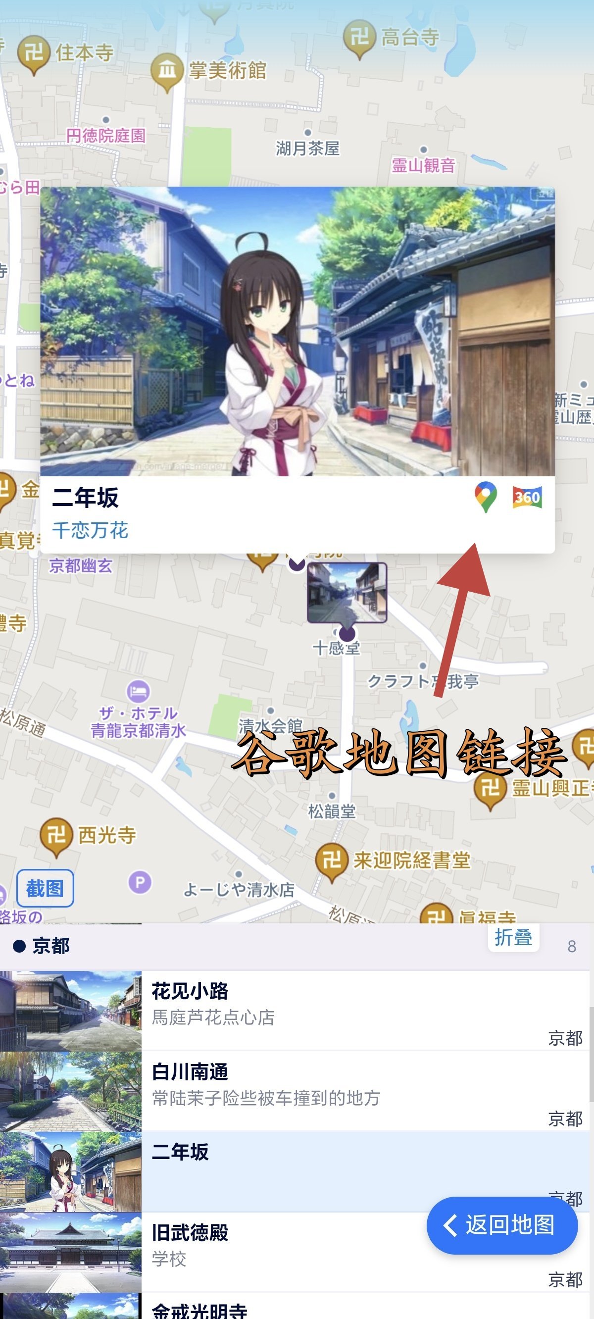 想要圣地巡礼?那就一定离不开动漫巡礼的地图搜索Anitabi,在网站里你能看到各种动漫及游戏作品的圣地巡礼地标,点击图片即可查看详情,你也可以在搜索栏输入自己感兴趣的作品名来查看动漫截图的右下角是谷歌地图的链接,点进去然后打开谷歌地图,可将地点保存并命名,方便实际巡礼的时候确定位置