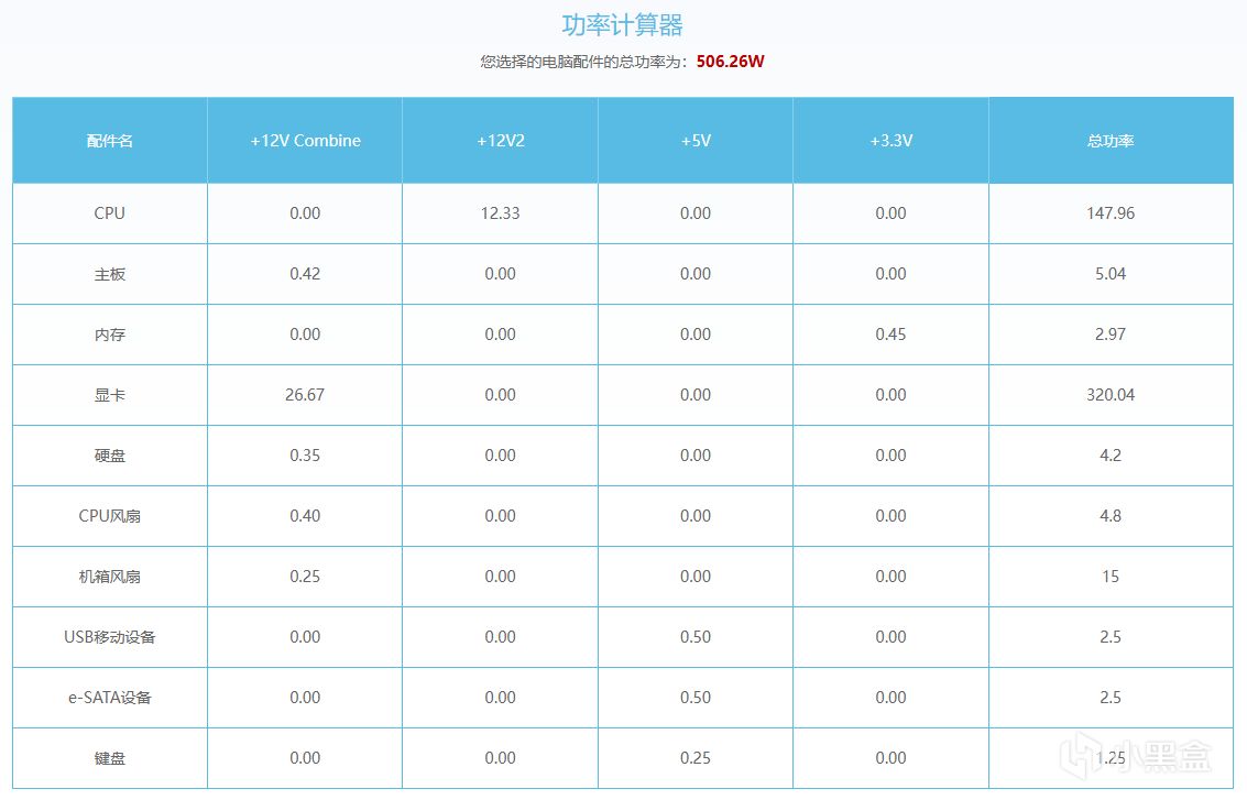 如圖所示,以我的主機爲例,算出來的最終總功耗爲506w,按照慣例,往總功耗上加個150w左右便可得到推薦的電源功率。