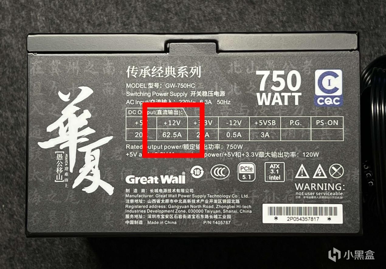 還是以我在用的這款長城華夏傳承750w舉例,12Vx62.5A=750w,正正好好,完全無任何虛標,用這個方法,便能排除掉一部分虛標電源。