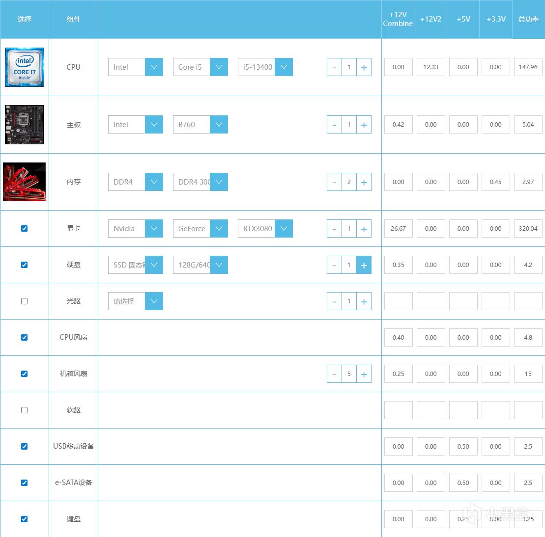 至於如何留夠安全冗餘,首先大家得知道如何算出自己主機的大概功率,只需打開瀏覽器,搜索功率計算器,之後在計算器內填入自己的主機配件,即可得出總功耗。