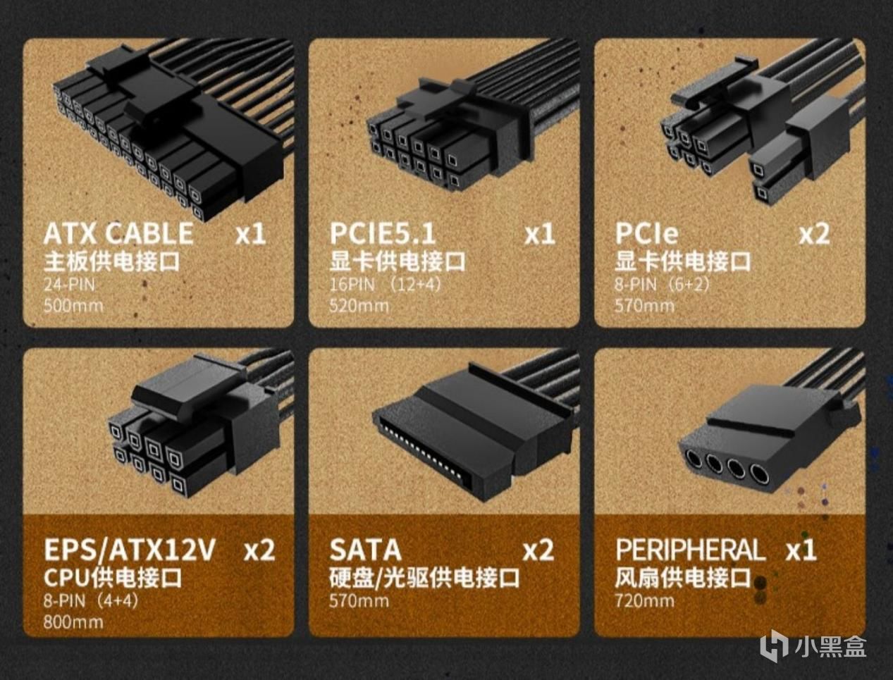 還是以我在用的這款長城華夏傳承750w電源舉例,線材接口爲24pin供電一根、長度500mm;PCIe5.1供電一根、長度520mm;CPU4+4兩根、長度800mm;PCIe6+2兩根、長度570mm;SATA兩根、長度570mm;Peripheral一根、長度720mm。