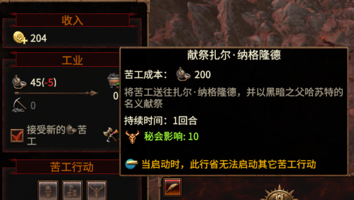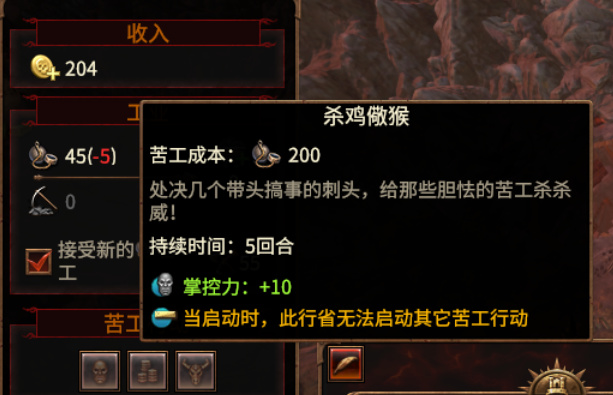 「苦工」靠打败敌方军队和建筑生产增加。在城镇选项里,消耗他们可以提高掌控力、增加金钱和秘会影响值。