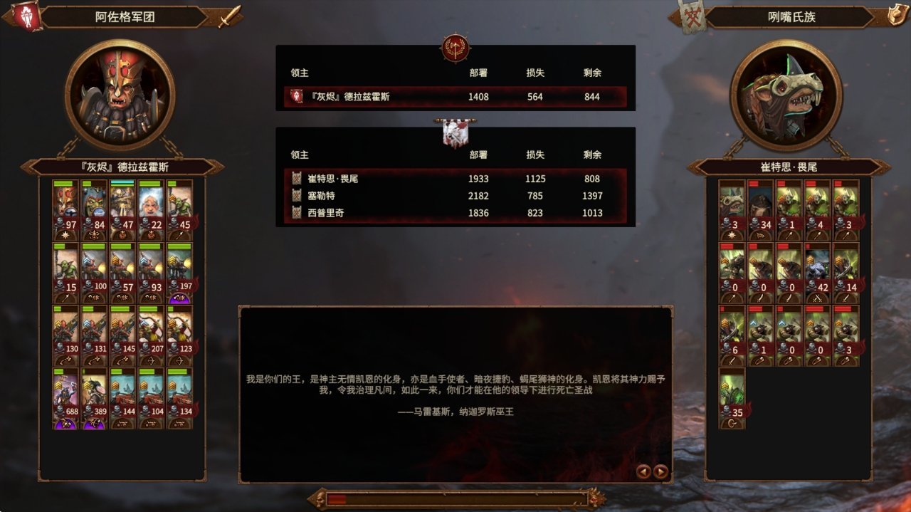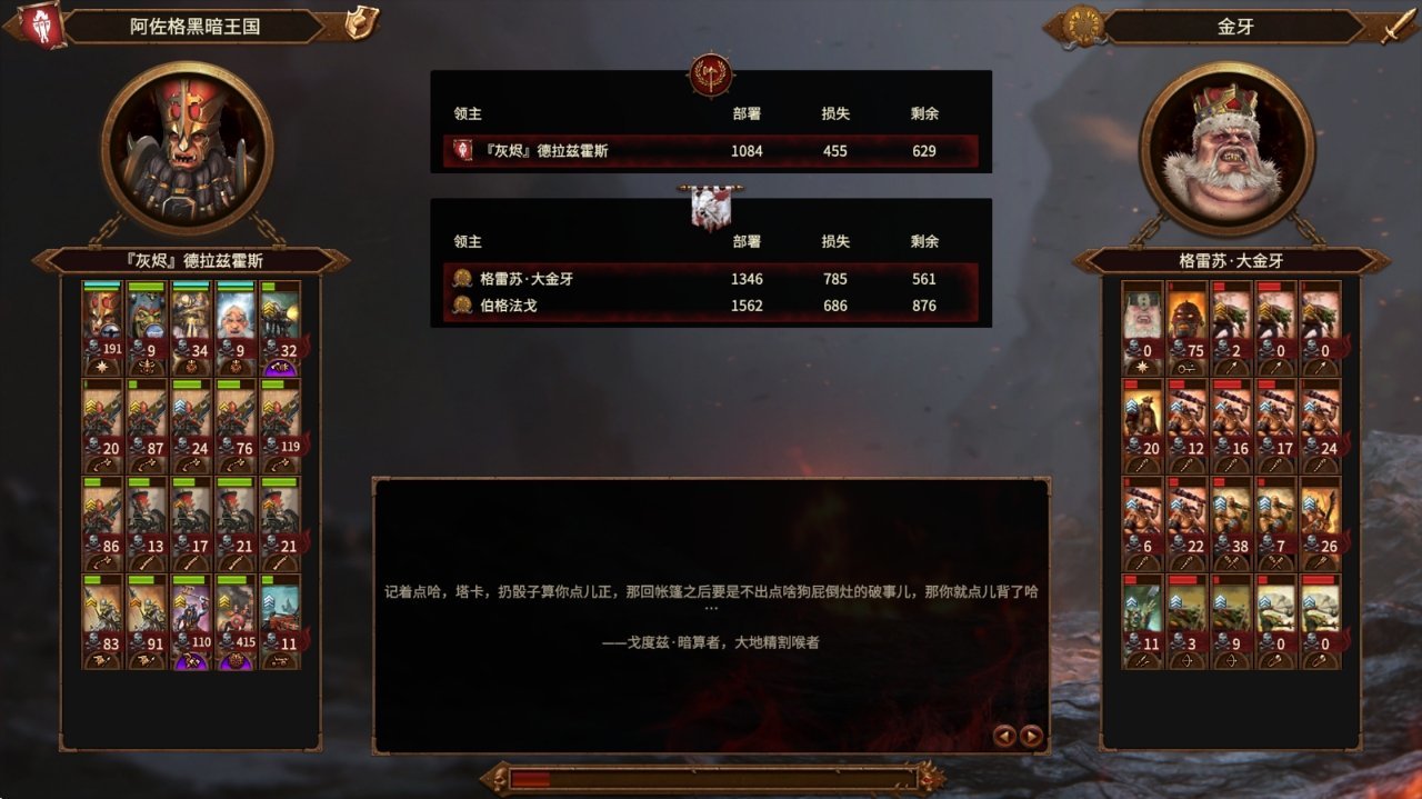 总结一下,混矮前中期比较难受,按照秩序方的习惯来打的话,就只能用大量的地精单位和少量本族单位,来凑成满编,但领主和事务官却很强。