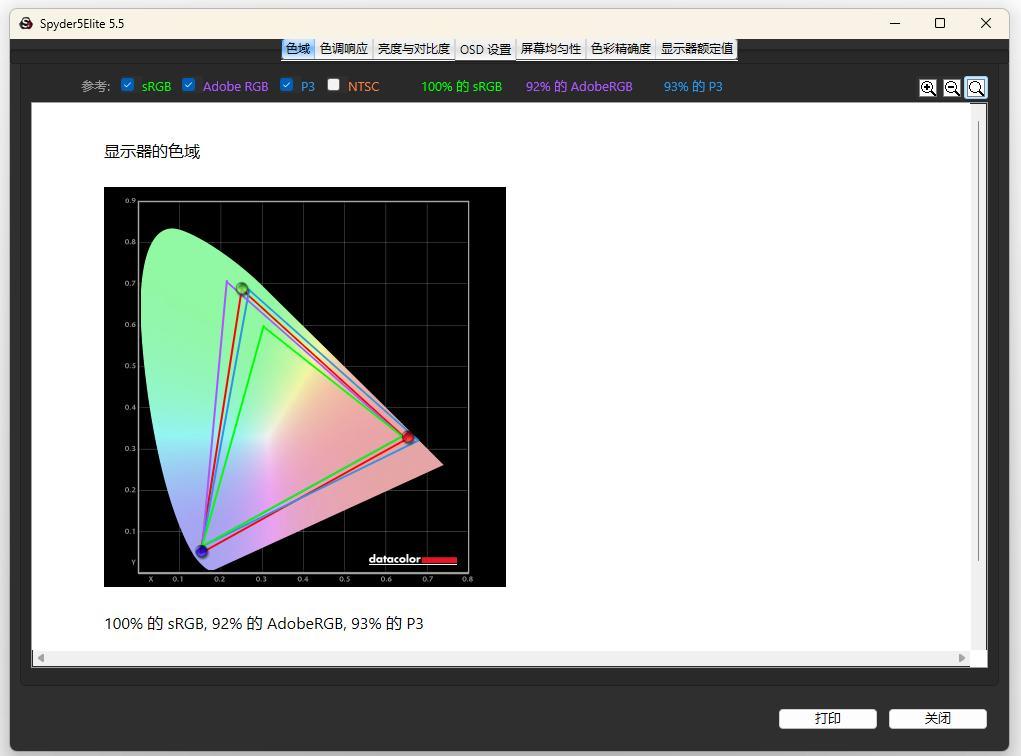 测试结果显示,微星MAG 274QRFW X32具备100%的sRGB(红蜘蛛校色仪最大只能到100%)、92%的 AdobeRGB以及93%的P3色域覆盖,与官方标注没有太大差异。