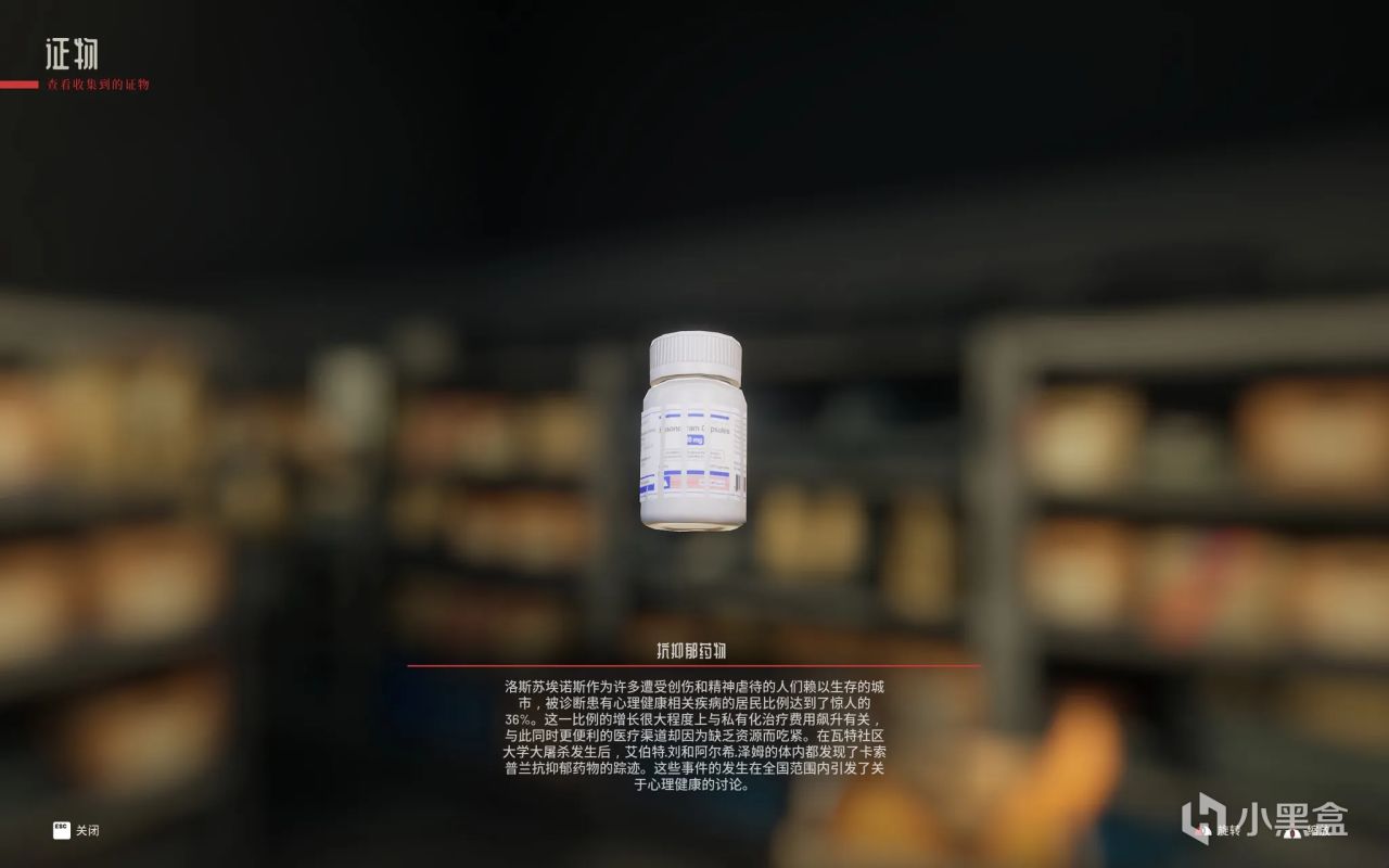 几名枪手中可以确定至少有两人患有抑郁症。当你活捉嫌疑人时,有时可以听到他们说“终于结束了”,或者他们会开始哭泣。任务完成后可以在证物室发现抗抑郁药物。据提及,阿尔伯特·刘(Albert Liu)和阿奇·泽姆(Archie Zem)体内都检测出了卡索普仑(Kasonopram)抗抑郁药。