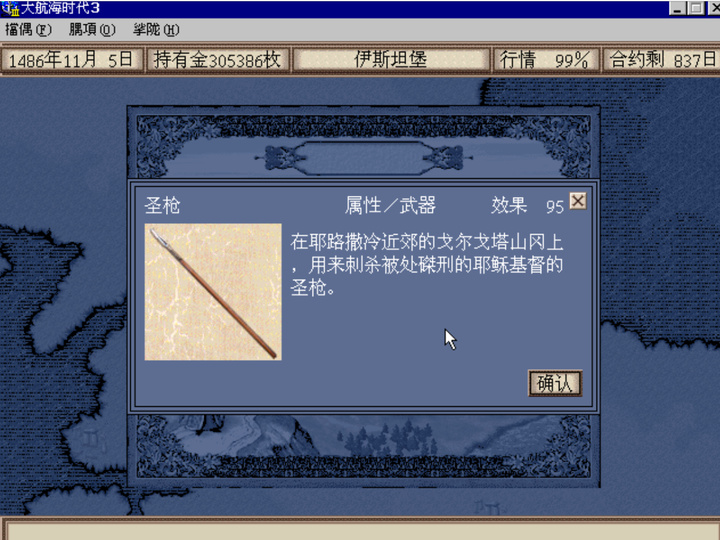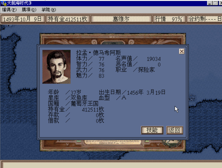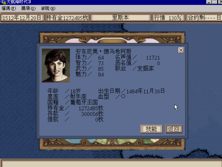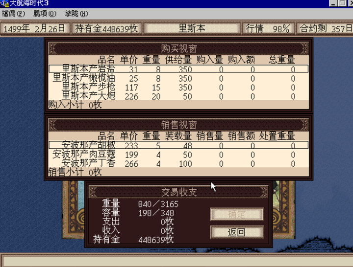 這個回答寫到這裏才第一次提到貿易,貿易確實在大航海時代3裏不太重要,因爲花錢的地方真的很少,不能像2代和4代一樣投資港口;唯一的大開銷,可能就是後期組建8條滿兵滿炮滿耐久的西班牙大帆船橫行海上和陸地了吧,不過這也就二百多萬足夠了。