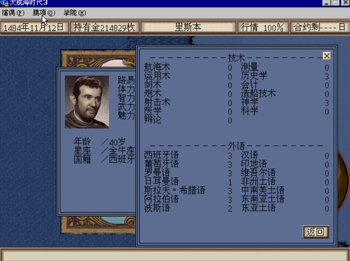 遊戲中在行會、教堂等地都可以學習語言和技能,但耗時很久。學習1級技能3個月,2級6個月,3級要12個月,如果角色智力不夠高,還要消耗額外的時間。差不多一個技能/語言學到3級要將近2年時間。初始角色拉孟23歲出道,自定義角色最早18歲出道,50歲之後就開始慢慢衰退,真正巔峯期也就30年左右,麥哲倫、哥倫布等歷史人物會根據歷史時間完成各種重大發現,必須搶在他們前面,時間非常寶貴。