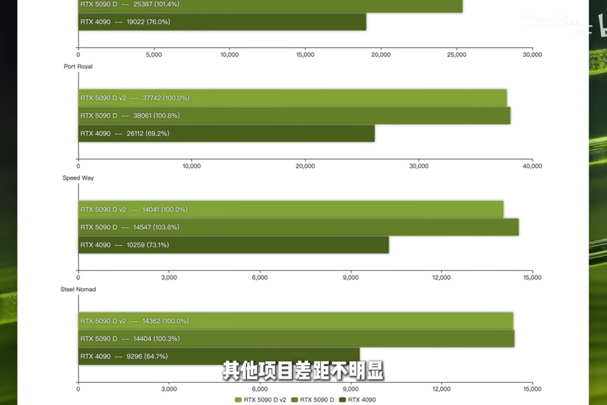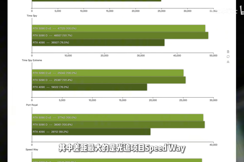 測評可以看到,在3dMark方面,5090D v2和5090D差距很小,5090D只比5090D v2強了3%-5%。只有光追SpeedWay的差距要大一點點。