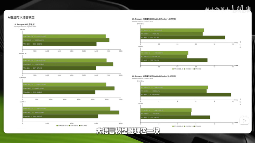 其次是AI方面,在不爆顯存的情況下,二者有一定差距,5090D比5090D v2強了10%。如果在參數較多的情況下,5090D v2爆顯存了,就是另外一回事了。(當然打遊戲不太可能爆顯存)