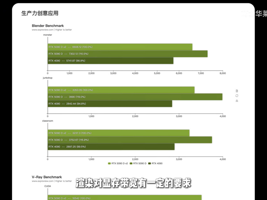 最後是生產力,渲染對帶寬有一定要求。在Blender中5090D比5090D v2強了19%,在V-ray中,5090D比5090D v2強了24.8%。在某些生產力上差距比遊戲大多了。