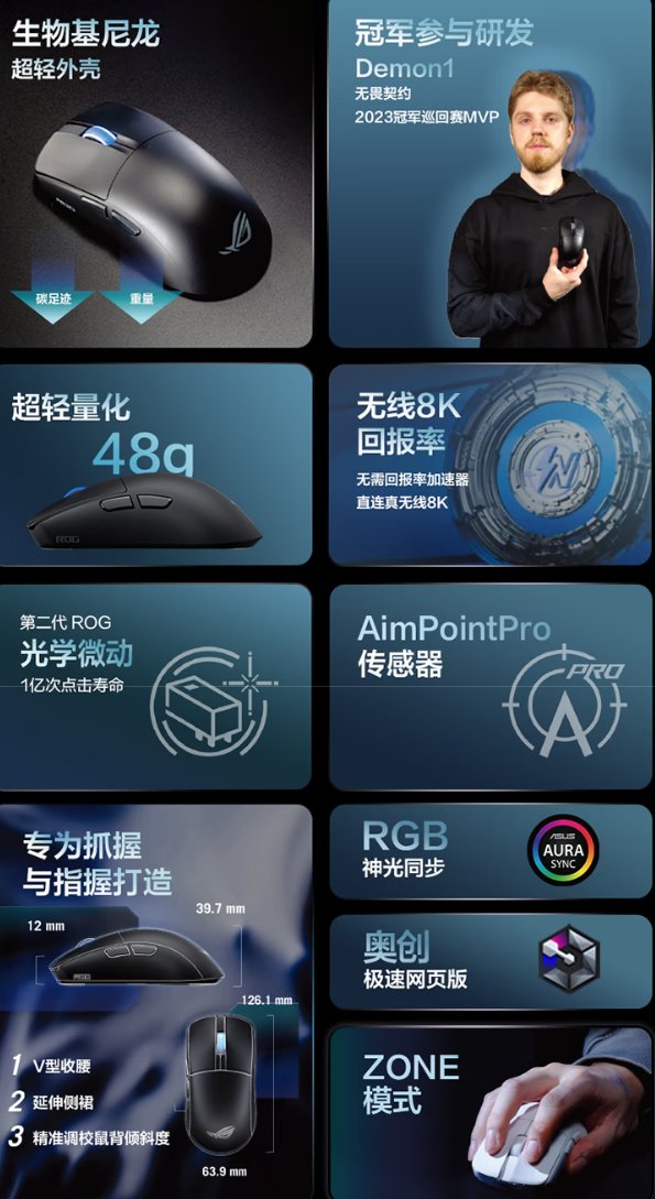 支持原生8K回報率,採用ROG光學微動,101小時長續航,黑白雙色。