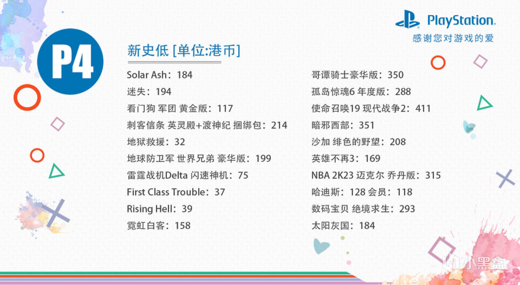 港服PSN商店最新折扣如約而至,此次爲2月優惠低至兩折,活動截止日期爲2月15日。按照慣例,我把幾乎所有遊戲的舊史低與新史低價格,都整理了出來。另外,我又從中挑選了最值得推薦購買的10款遊戲。除了價格、優惠力度之外,每款遊戲在不同平臺上的分辨率與幀數,也給大家整理了出來。下面讓我們一起來看一下吧!