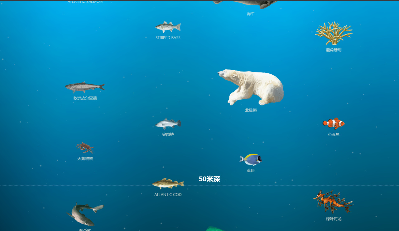 随着页面向下滚动,线下滚动,也会按深度依次看到各个海洋层级和不同的海洋的生物