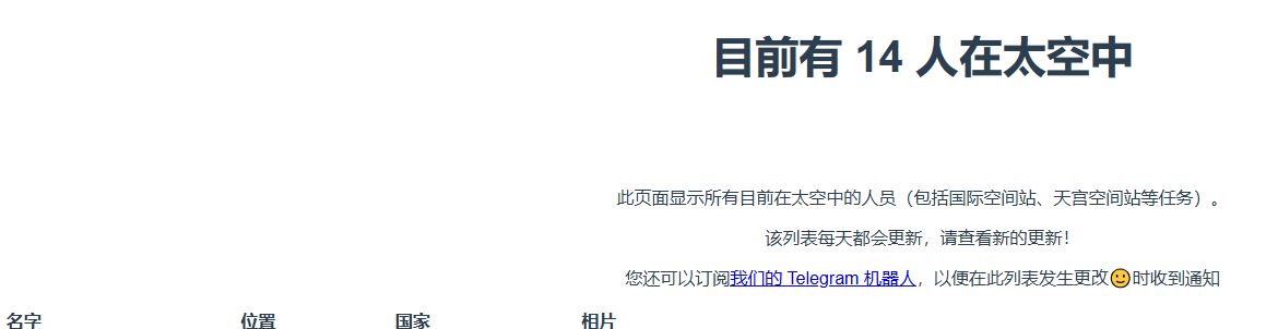 会显示目前在太空中的人员,每天都会更新,包括名字,国家位置等等