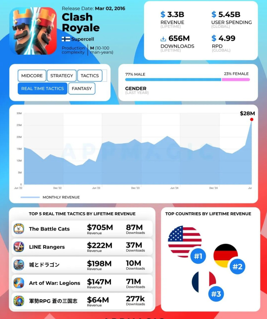 据Sensor Tower统计,今年上半年该游戏日活跃用户数已跃居全球手游榜单第三位,目前是Supercell产品矩阵中,日活跃用户数最高的游戏。