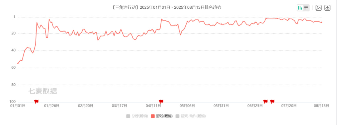 火爆的人气也反哺着游戏的市场成绩。以iOS游戏畅销榜单为例,《三角洲行动》2025年上半年从年初的Top50持续攀升,短短半年后,便已经稳定在了Top10的头部位置之内。