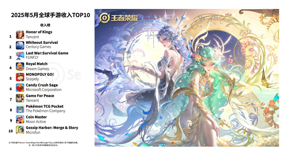 来到了Q2季度,游戏仍然在多维度发力。特别是随着今年55开黑节的回归,多款皮肤的加持下,使得《王者荣耀》在4、5月蝉联Sensor Tower统计的全球手游收入榜以及收入增速榜的冠军。