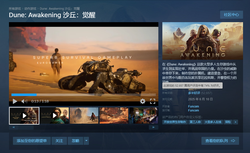 2020年,Funcom被腾讯全面收购,正式成为腾讯的海外子工作室,并负责开发SOC游戏《沙丘:觉醒》。直到今年6月,游戏正式公测发售,短短不到两周时间内全球销量突破100万,成为Funcom有史以来销售速度最快的游戏,并且在Steam平台的同时在线峰值超过18.9万。