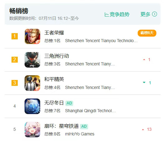 第二个观察,便是腾讯越来越多的产品都已经来到了细分品类头部,甚至是第一的位置,彰显着前者之于国内游戏市场的强大影响力。