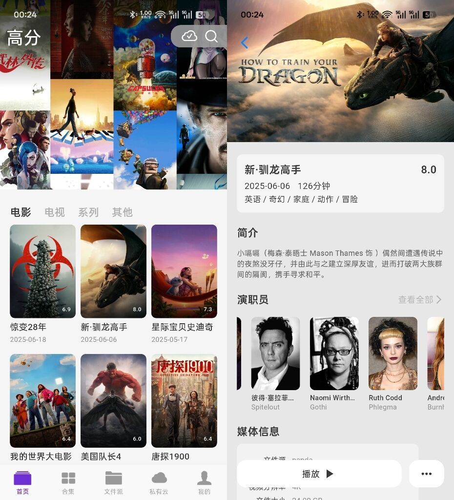 登陸之後就能看到我們添加的媒體資源了,首頁的信息流做的非常不錯,頂部的高分信息流是滾動形式的,右滑還能顯示字最近上映,界面非常好看。同時影視資源的界面也做得不錯,對應的海報、分類、簡介以及演職表都有。