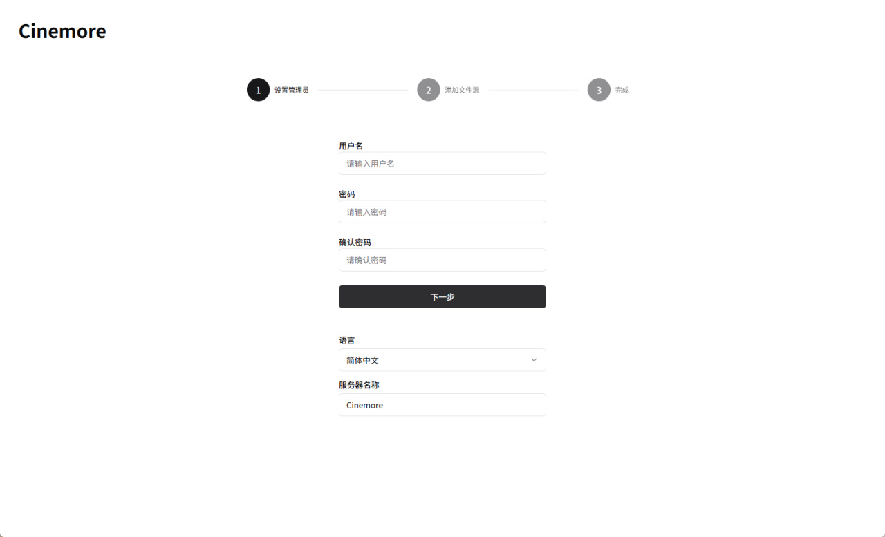 部署完成之後通過映射的本地端口就能訪問項目的Web界面,首次使用需要我們設置管理員、文件源等信息,跟隨引導填寫就行。