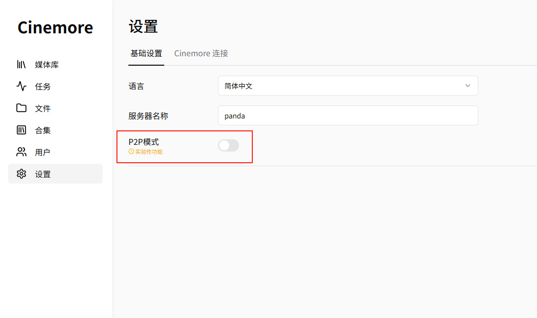 在設置中有一點比較有意思,Cinemore支持P2P模式,不過目前處於實驗性功能,熊貓也沒有去體驗,但如果能完善,那麼對於有公網的用戶體驗會提升不少,這算是Cinemore自身非常不錯的優勢點。