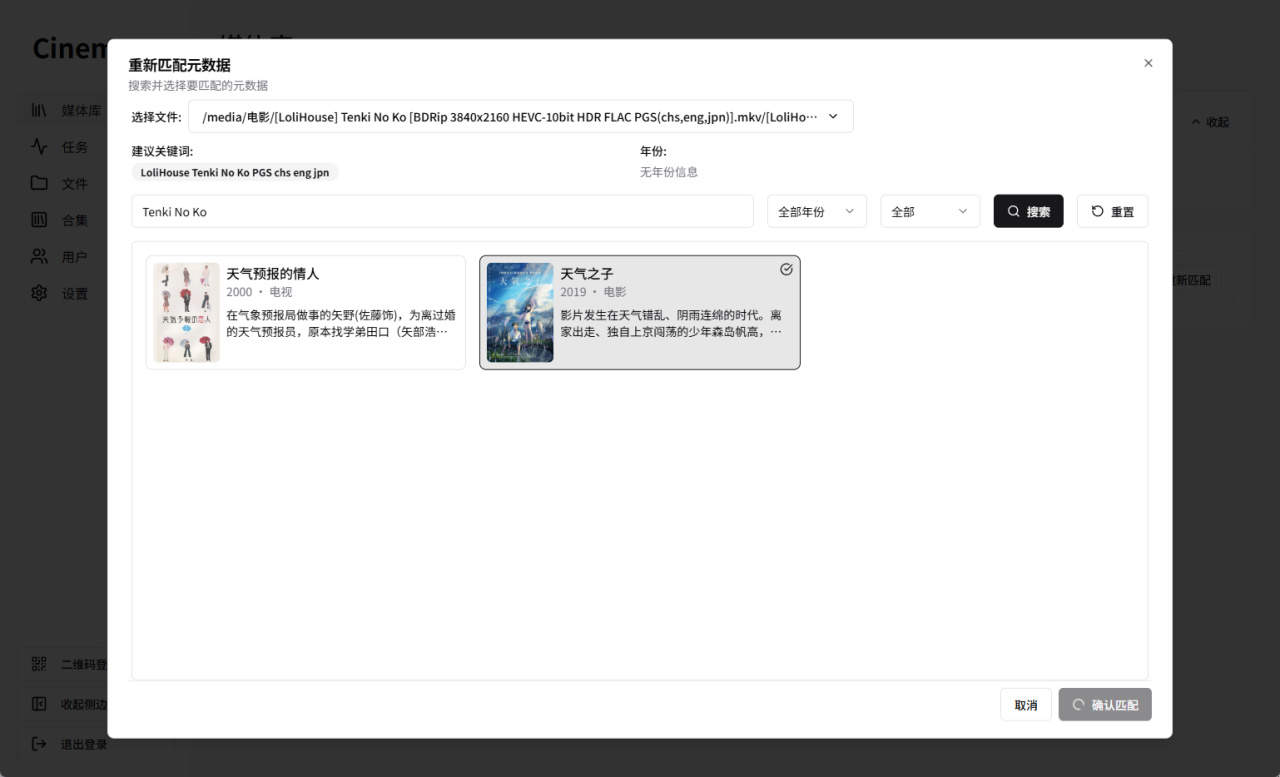 其中有一個未匹配的項目,原因是因爲文件名不規範,畢竟是小網站下的。這時候切換到媒體庫,選擇未匹配項目,可直接進行重新匹配,Cinemore也會給出對應的關鍵詞建議,搜索到之後選擇匹配就行了。