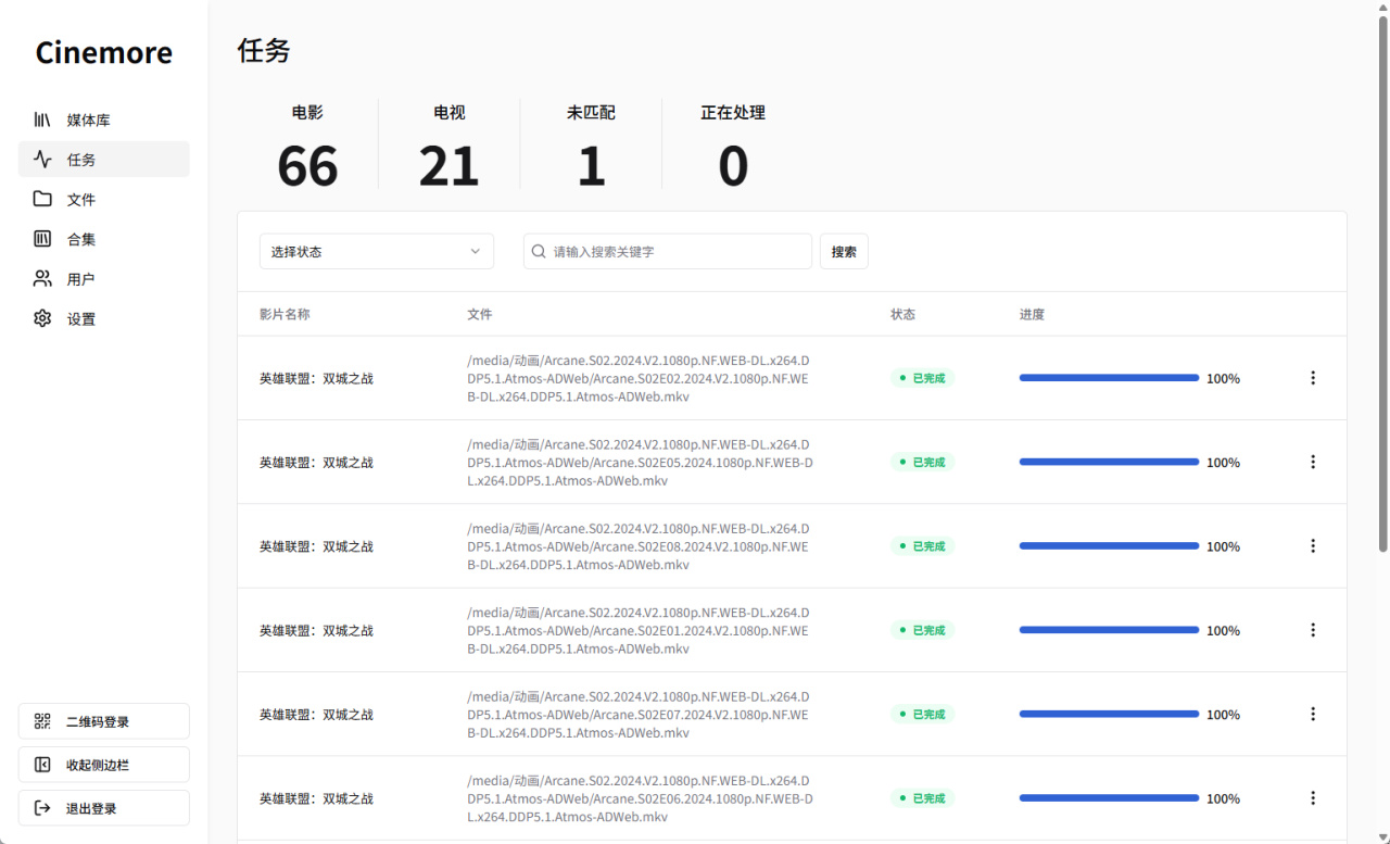 添加文件源之後在任務這一欄能看到Cinemore已經開始進行匹配處理了,處理速度非常快,且精準度也非常不錯,貌似是因爲他們有做刮削源的緩存服務,所以匹配速度非常不錯,除了文件名本身就不對的以外,其他的都能直接匹配上NFO信息。