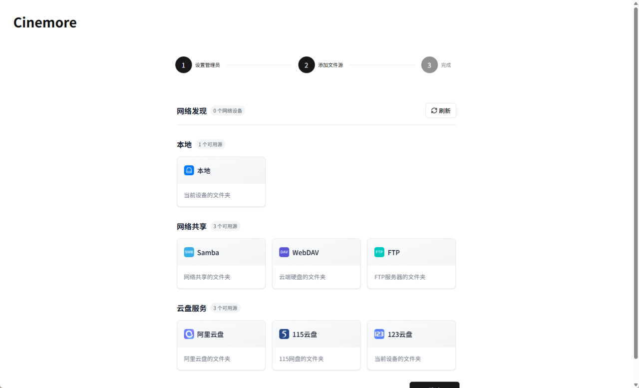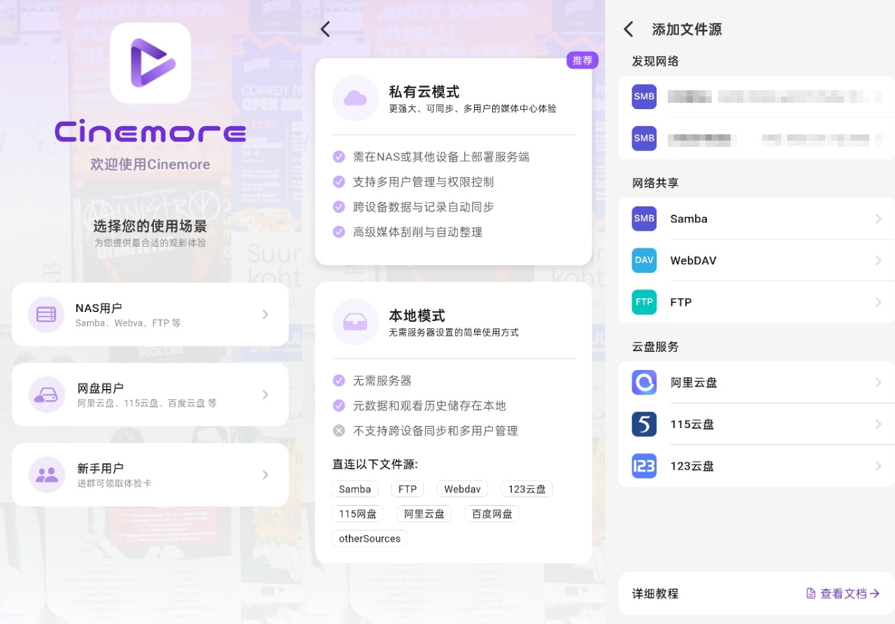 在文件源這裏可以看到,除了支持本地以外,Cinemore還支持smb、webdav以及ftp網絡協議,此外也能直接對接阿里雲盤、115雲盤與123雲盤,如此一來能通過它將咱們雲盤中收集的各種影視資源彙總到一起,這一點還是蠻方便的。