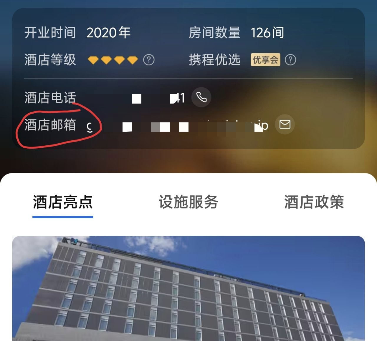 打開攜程,搜索到酒店,然後點擊設施政策,進去就可以看到酒店郵箱。也可以通過地圖軟件或者酒店官網來找到郵箱。以下圖片爲示例: