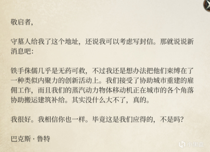 更新的后日谈里,还能收到巴克斯的来信。巴克斯在维和道路上越走越远了..