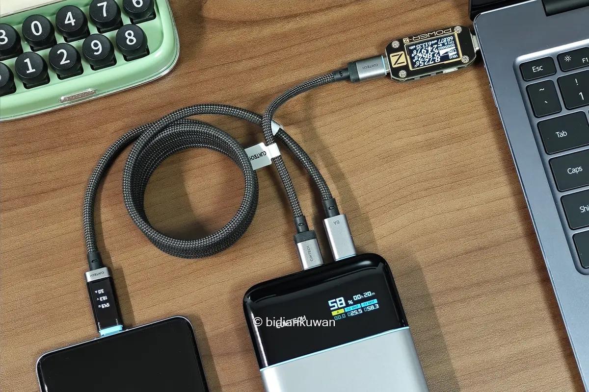 ▼多口输出场景复杂,如下图被充设备是我的65W Max的商务本(C1→华为MateBook 14),以及小米12Pro(C2口),C1口智能分配58.5W,C2口分配25.5W。