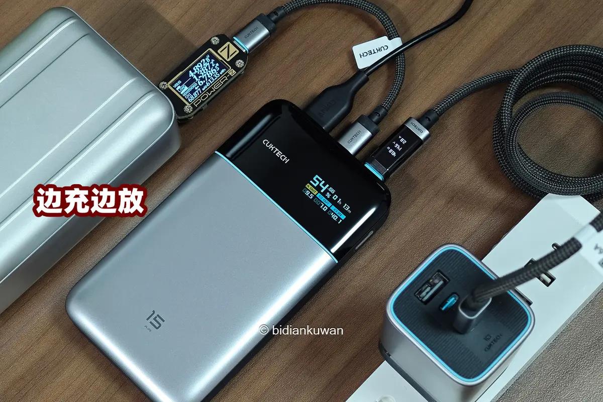 ▼酷态科15号Air同样继承了数字系列的“边充边放”能力,实时功率要根据接入设备具体分析,如下使用10号Mini氮化镓对15号Air回血,同时用C2和A口分别给另一个充电宝和一部红米手机充电。