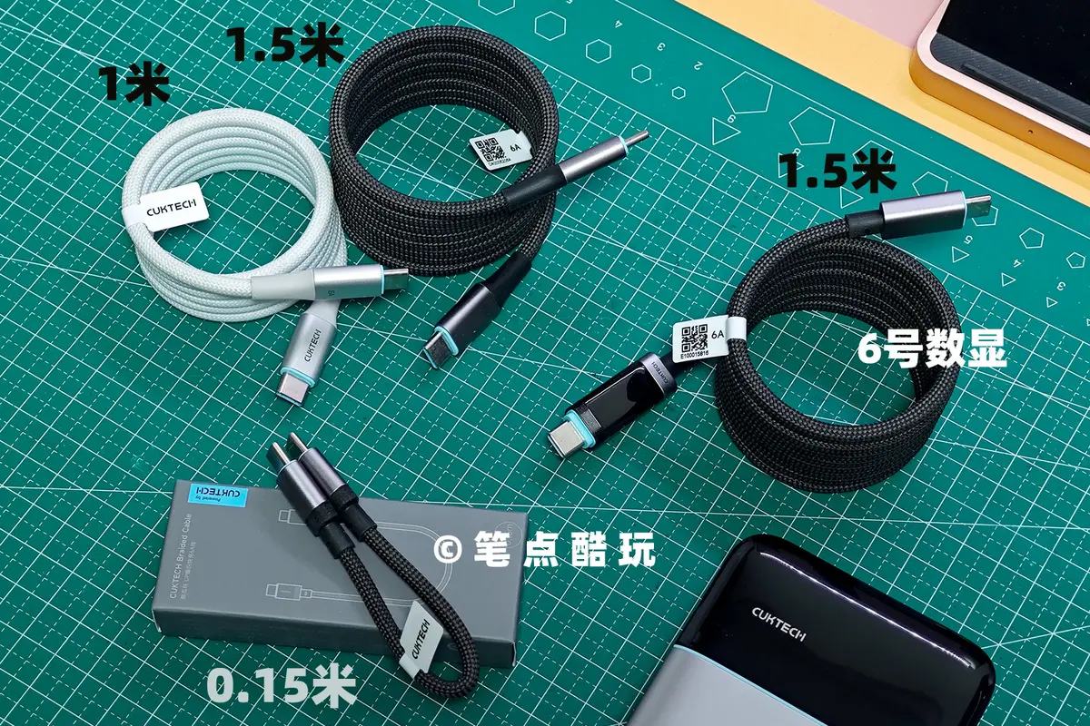 以上测试线缆分别使用了酷态科的6号数显磁吸编织线(长度1.5米);酷态科CP编织6A快充线(两个端子可以对着磁吸,长度15cm);酷态科磁吸编织线(长1米)。