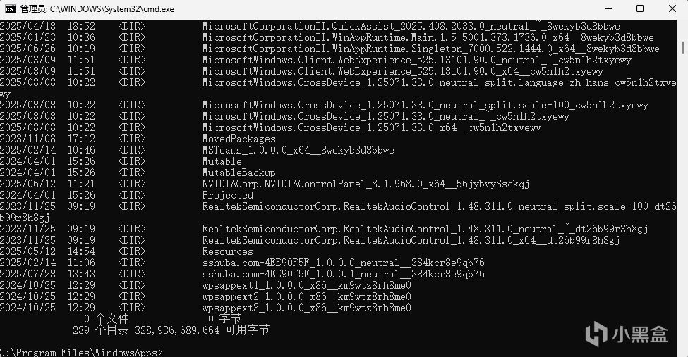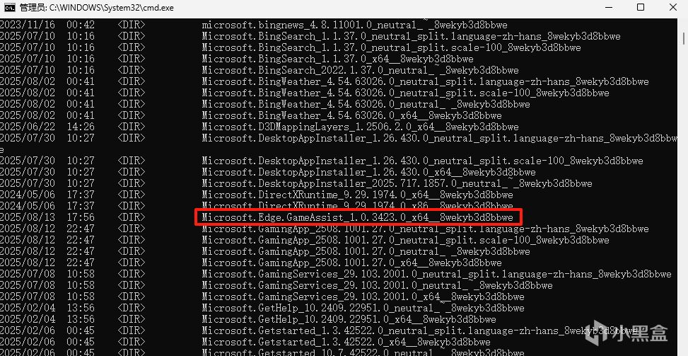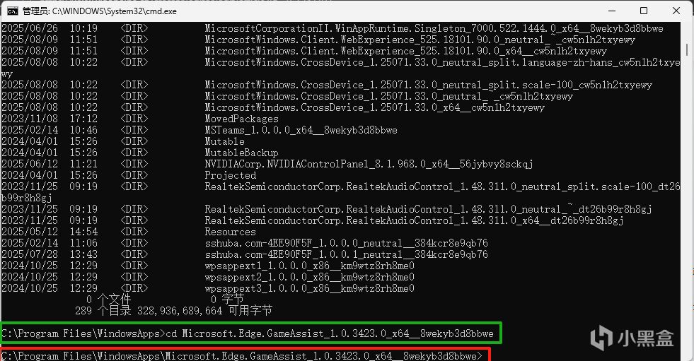 所以我们应该在C:\Program Files\WindowsApp目录下输入dir,列出所有的文件夹名字,去找edge游戏助手的文件夹。输入: