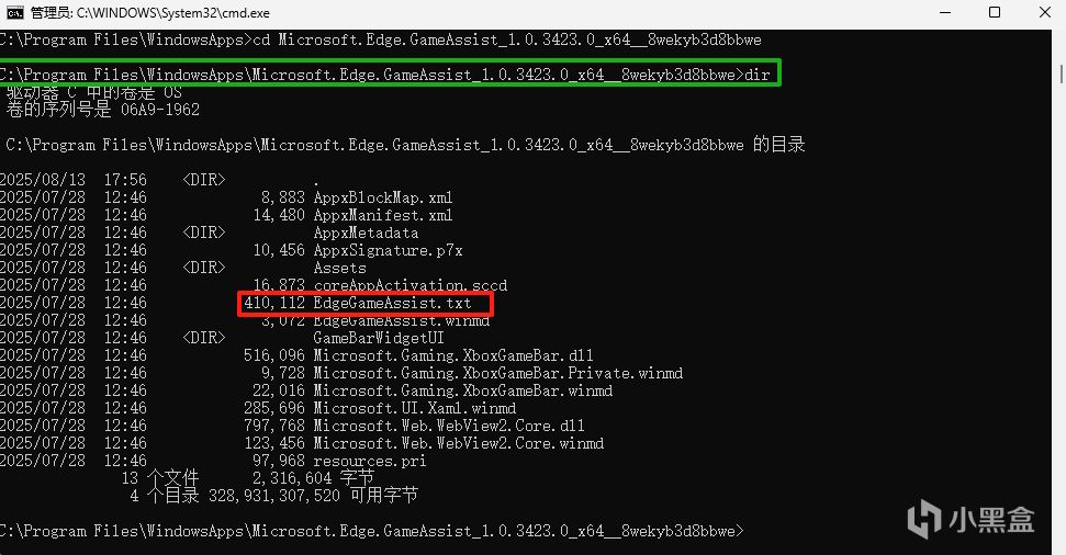 然后你可以用dir命令看一下,是不是已经变成上面那个截图里红框显示EdgeGameAssist.txt这个样子,如果是就大功告成了。