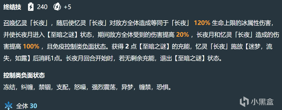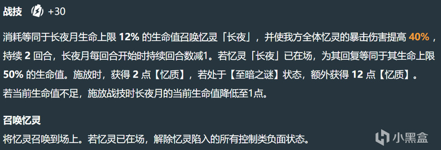 「長夜」免疫控制類負面狀態, 被攻擊的概率提高。「長夜」在場時,長夜月和「長夜」造成的傷害提高 50% 施放技能時消耗自身生命上限的 1% ,若當前生命值不足改爲降低至1點