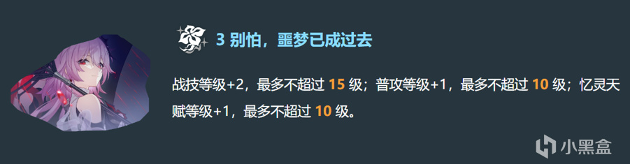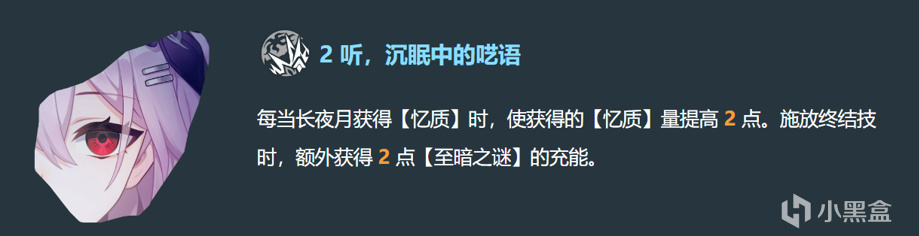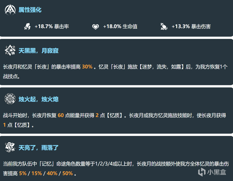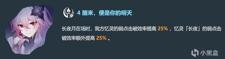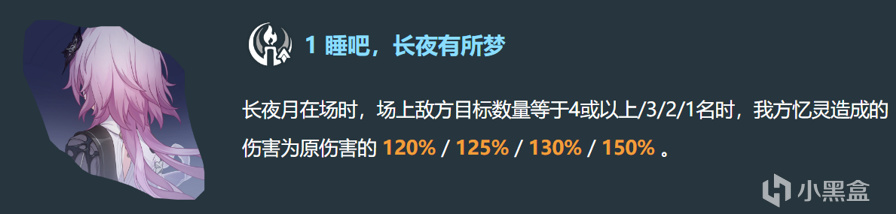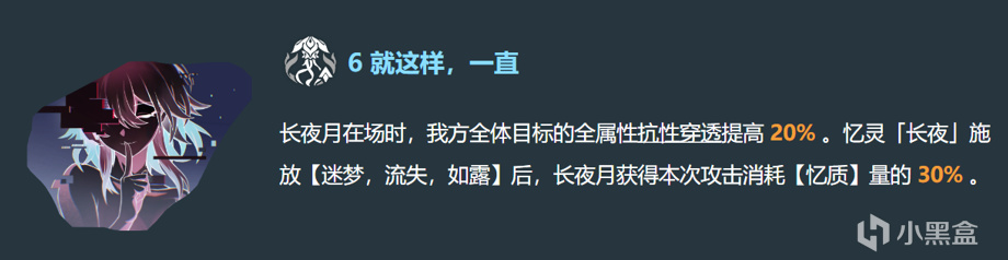 進入戰鬥時召喚憶靈「長夜」。憶靈「長夜」初始擁有 160 點速度,生命上限爲長夜月的 100%。長夜月或憶靈「長夜」每次生命降低時,使自身和憶靈「長夜」的暴擊傷害提高 60%,持續2 回合,並獲得2 點【憶質】。該效果每個目標每次受到攻擊最多觸發1次。長夜月持有的【憶質】大於等於 16 點時,解除並免疫控制類負面狀態,若憶靈「長夜」在場,使其立即行動。立即行動效果在憶靈「長夜」施放【迷夢,流失,如露】後方可再次觸發。