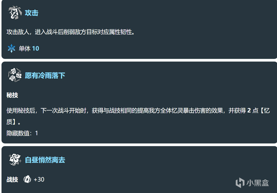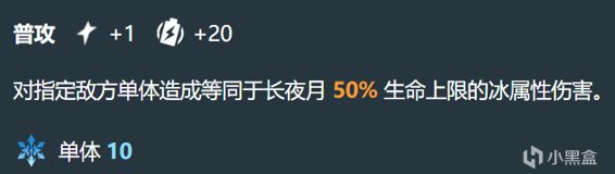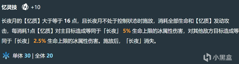 該技能自動選擇目標施放,優先攻擊長夜月上次攻擊的敵方目標。對敵方單體造成等同於「長夜」 20%生命上限的冰屬性傷害,長夜月當前每有4點【憶質】,則額外造成等同於「長夜」 4% 生命上限的冰屬性傷害。施放後獲得 1點【憶質】