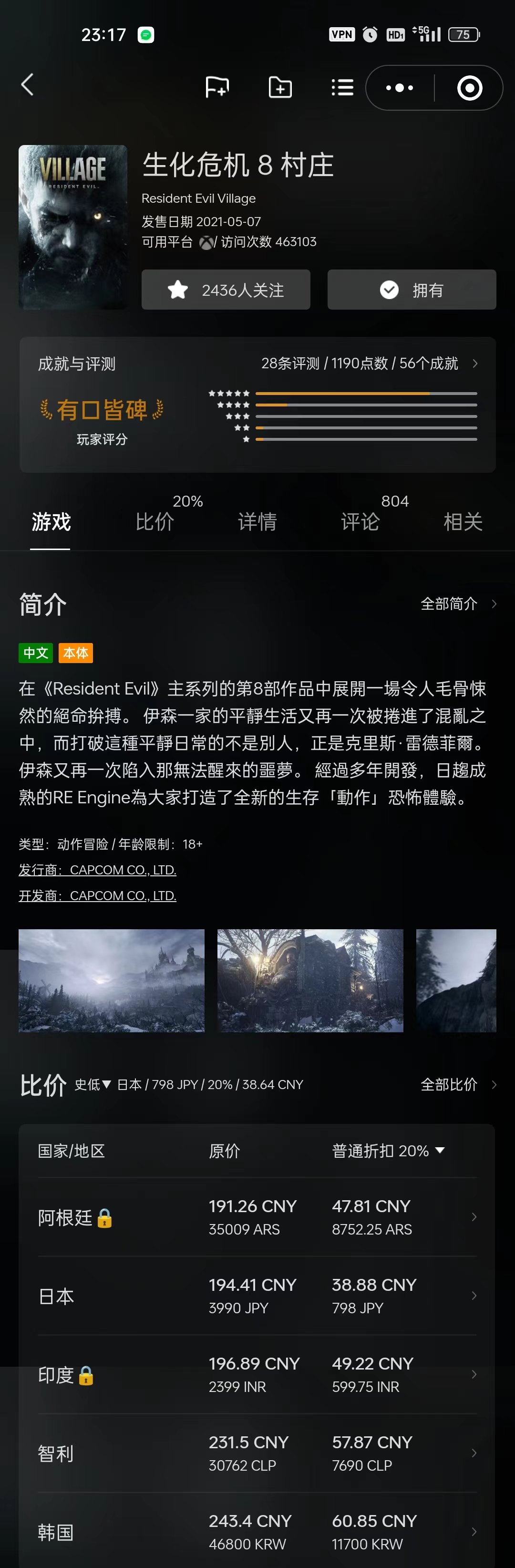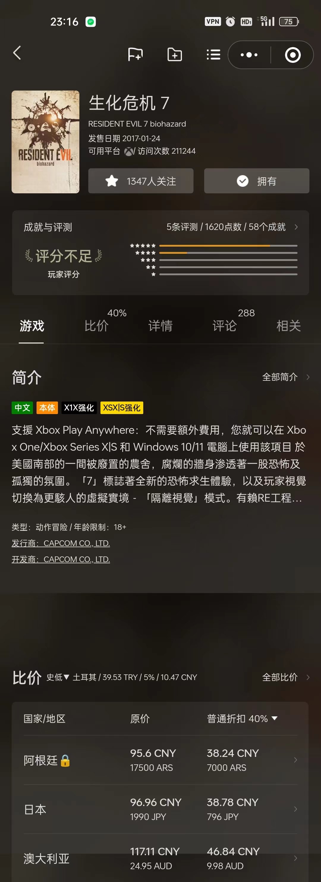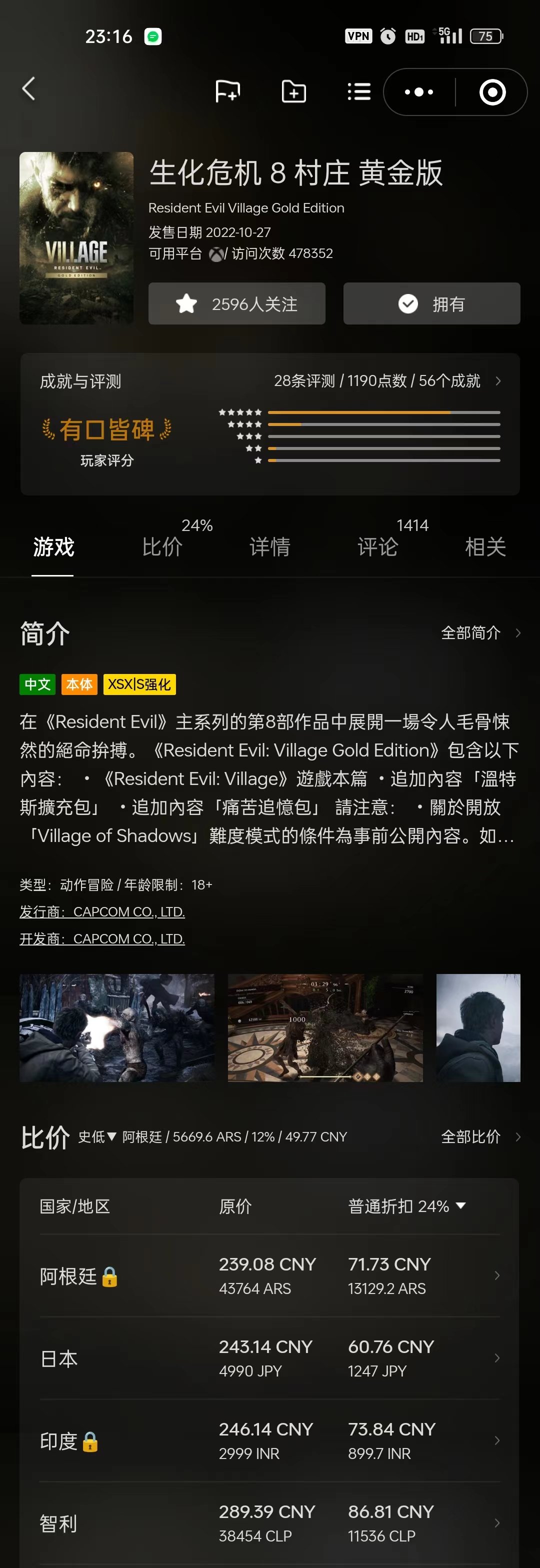 2、生化危机7 黄金版 & 村庄 黄金版 阿根廷区价格约¥95.64 /韩区价格约¥121.96 / 土区价格约¥123.2 / 智利区价格约¥125.41