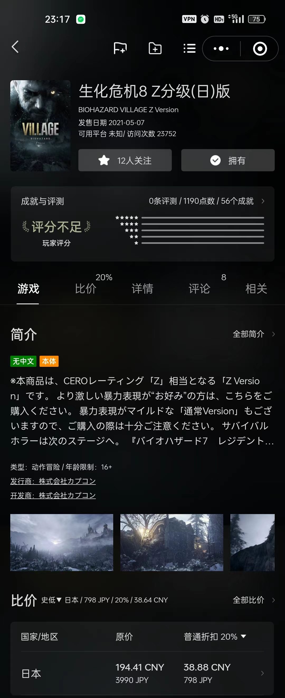生化危机8 Z分机(日)版本 和谐了血腥镜头 日区价格约¥38.88