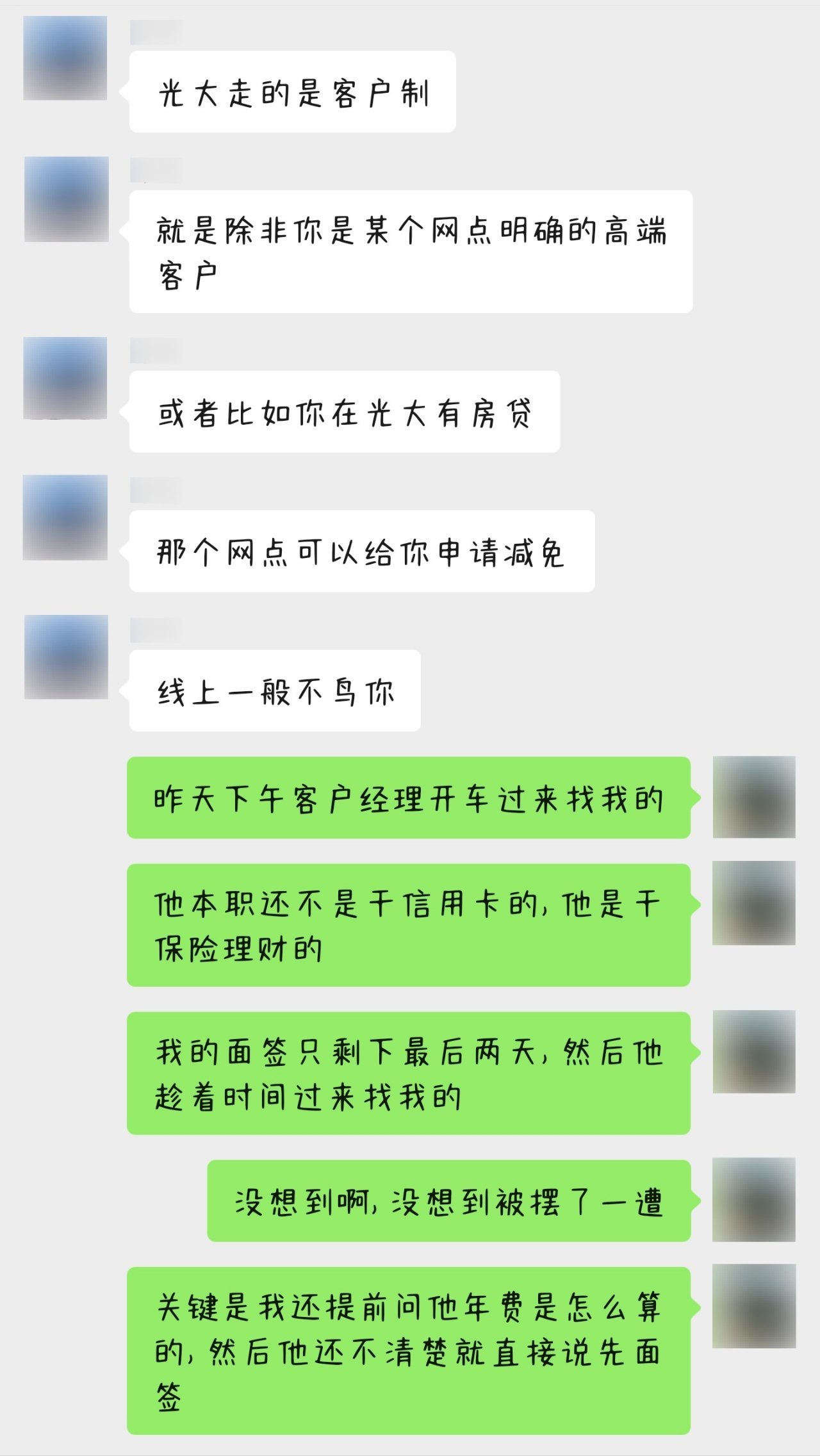 关键这还不算完,过了阵子,这个银行的一个客户经理来电话了,问我有没有时间去面签,我当时在忙,所以直奔主题,就问年费是怎么算的,他支支吾吾的半天说不清楚,最后还是跟我约了时间主动上门找我面签,其实到这里我就不是很想开这个卡了,但没有忍心果断拒绝,还是跟她约了时间见面
