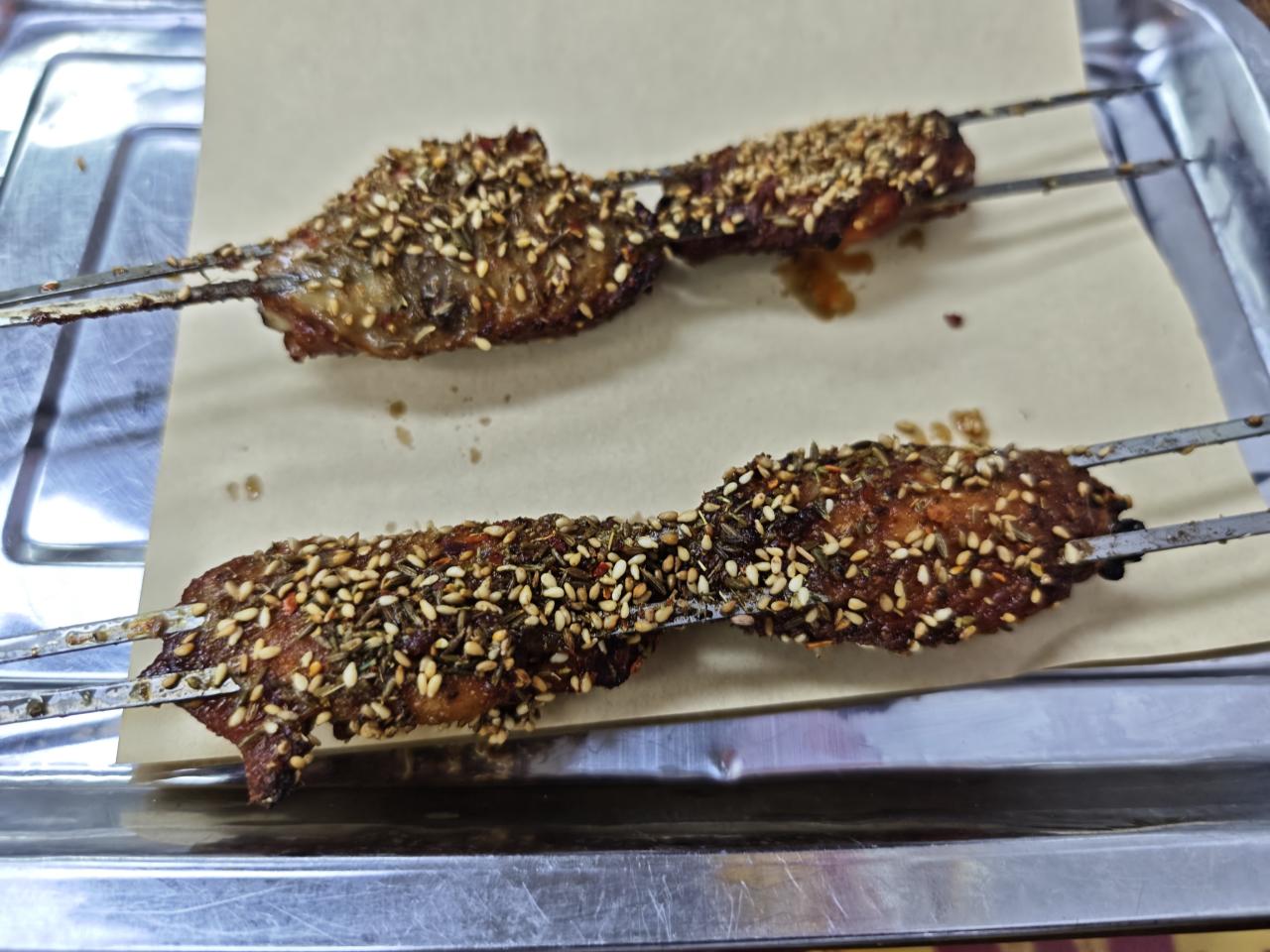 晚上去吃马波烤肉,因为我吃不了辣,所以都是点不辣的。点了,鸡翅,鸡脆骨,牛肉,腰子,牛肚,马面鱼,一个油馍,一个馕。