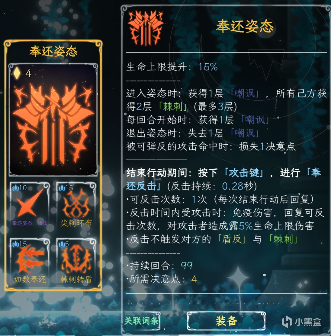 游戏里还有一个特殊姿态——奉还姿态,创新了弹反玩法,难度较高,对于出招时间把控的能力要求较高,玩得好的玩家可以轻松做到以弱胜强。