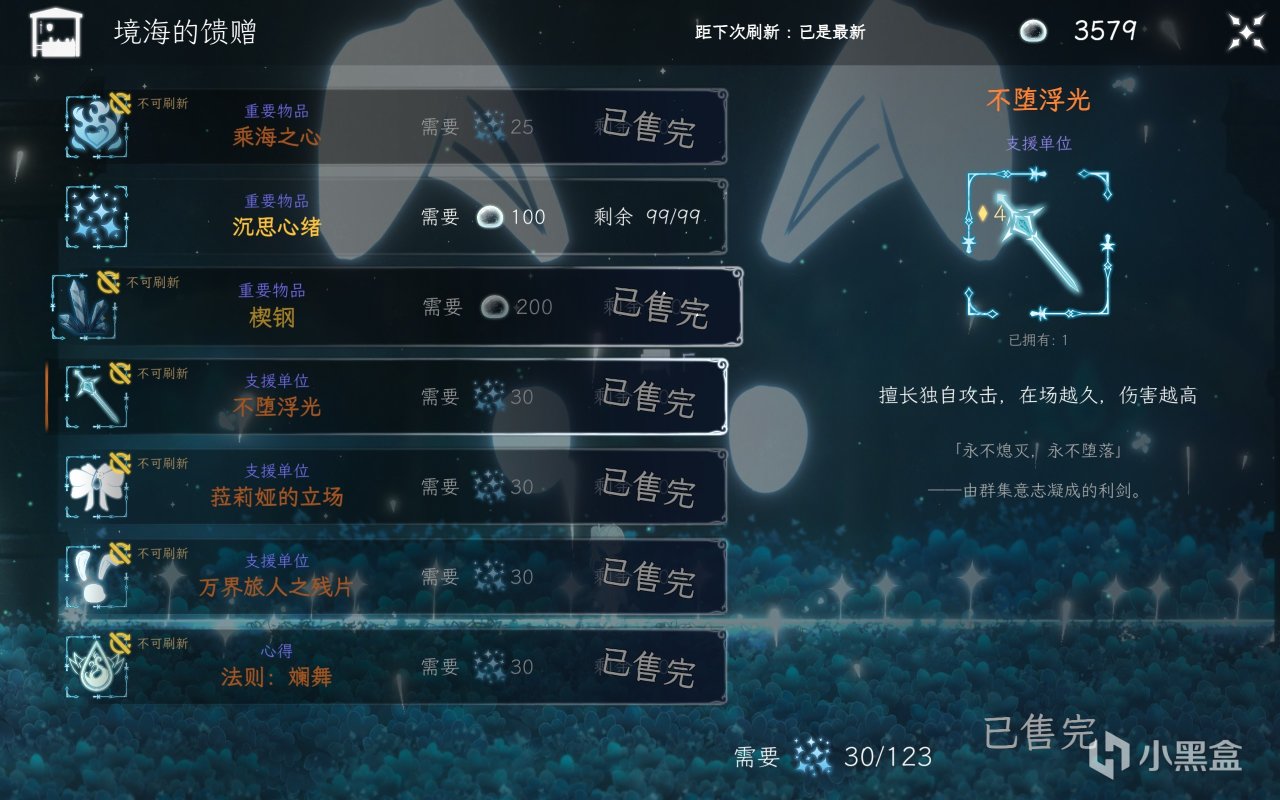 初始支援在“不堕浮光”(单体爆发)、“万界旅人之残片”(回复)、“菈莉娅的立场”(范围伤害)三选一,未选取支援及其他支援可以通过任务、商店购买、击败boss等途径获取。
