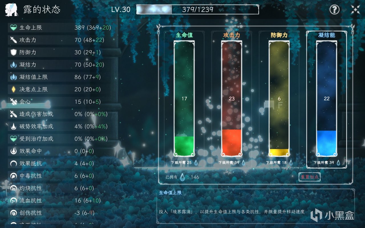 露的生命值、攻击力、防御力、凝结能四个属性可以通过在“露的状态”界面自由加点来获得提升,加点可重置,可预设。
