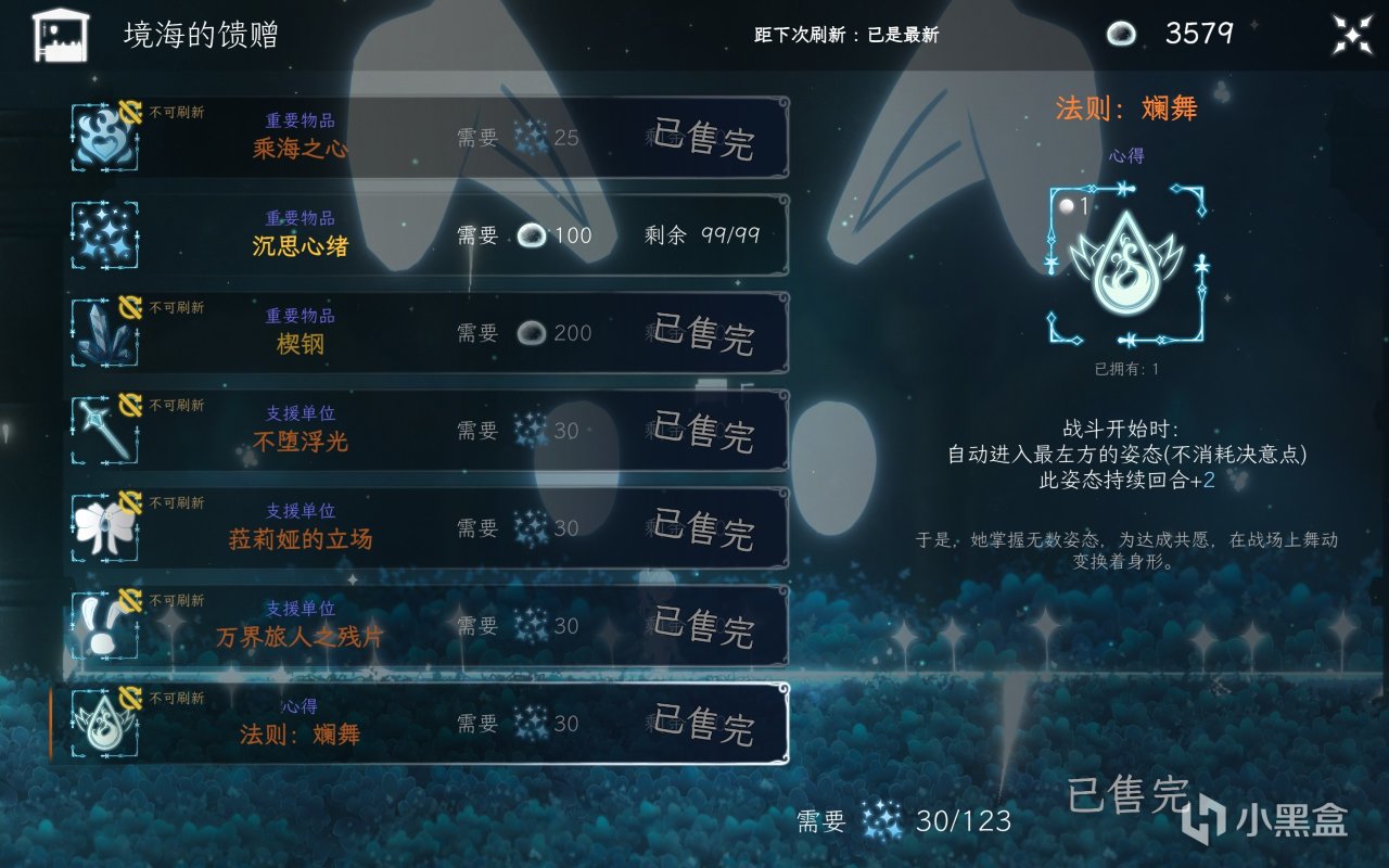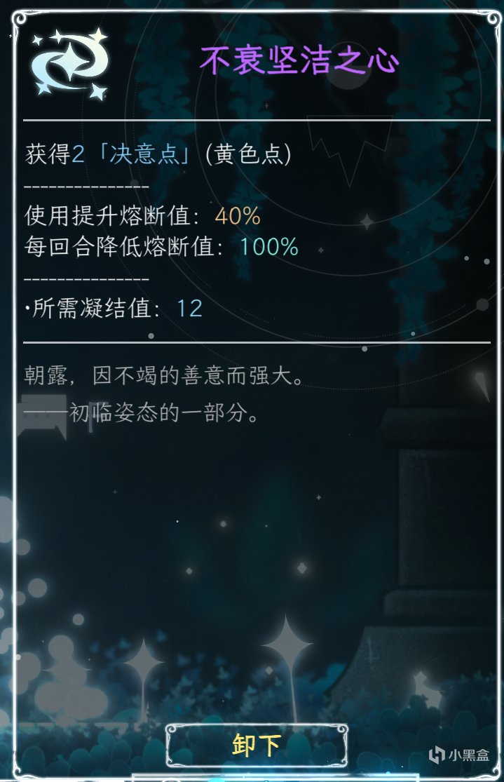 “不衰坚洁之心”:获得决意点。可以让决意点得到补充,化解很多尴尬的情况(例如放完支援,发现没决意点切换姿态了)。